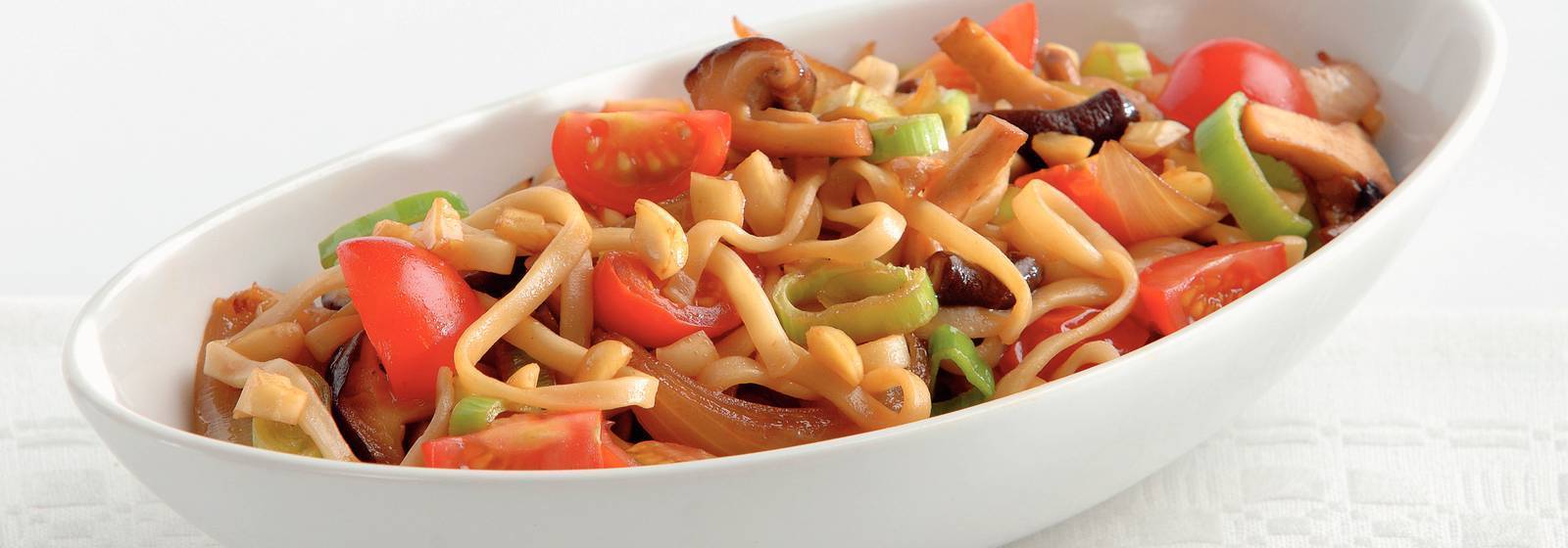 Une belle recette japonaise. Le plat principal végétarien contient les ingrédients suivants: nouilles (boîte de 500 g), oignons, amandes, tomates cerises, shii-take (100 g), huile de tournesol, poireaux émincés (300 g) et sauce de soja japonaise (bouteille de 150 ml).