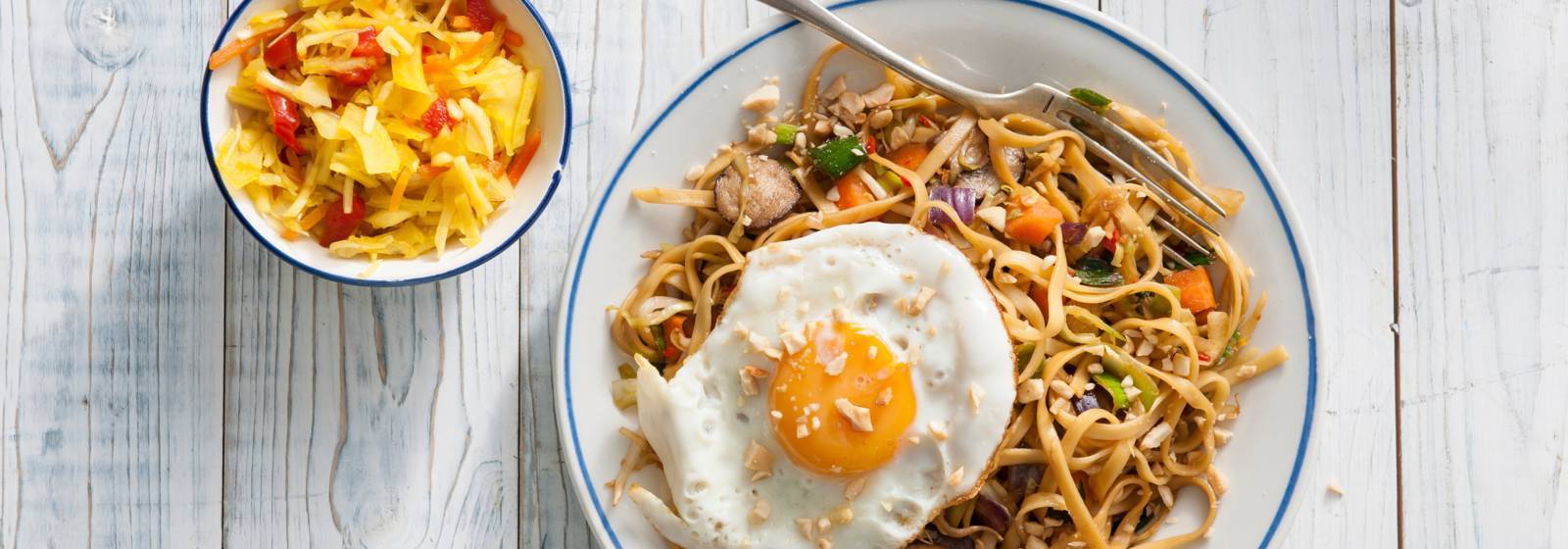 Nouilles au gingembre, sauce soja, œuf, cacahuètes, sambal et légumes.