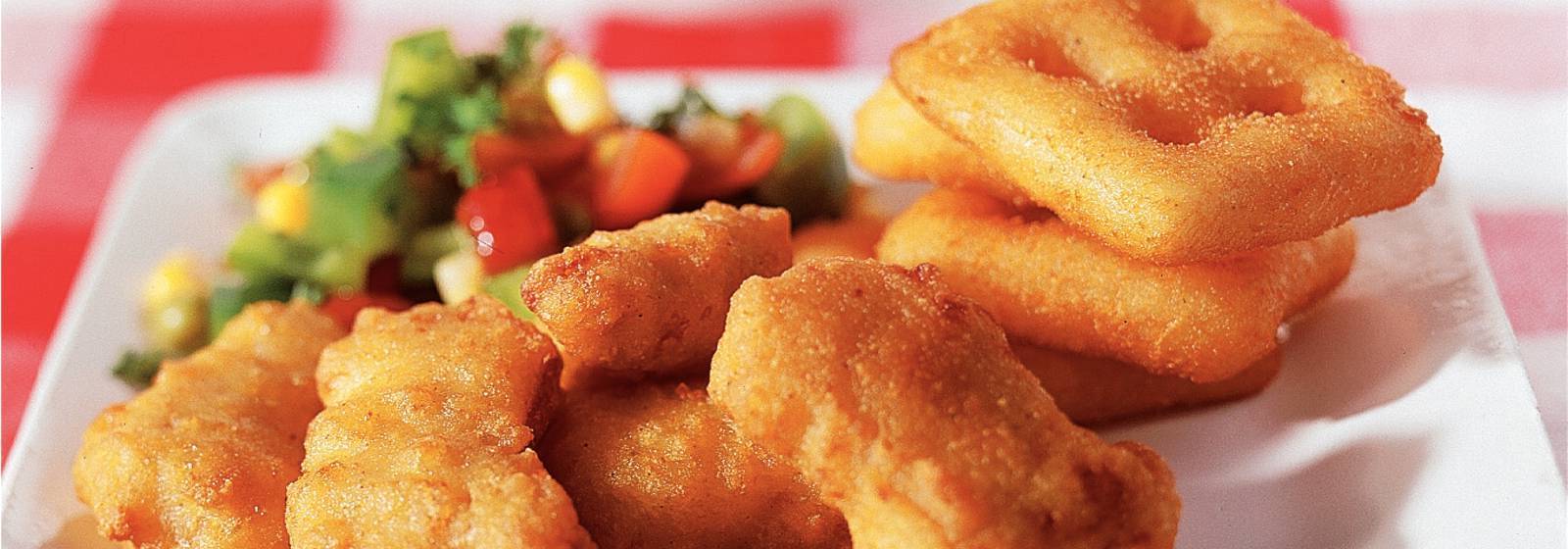 Une recette savoureuse. Le plat principal contient les ingrédients suivants: volaille, croquettes de poulet (surgelées, 250 g), gaufrettes de pommes de terre (congelées, 450 g), poivrons verts, tomates cerises (250 g), mélange d'épices italiennes fraîches (20 g), trempette de salsa douce (pot), Mexicomelange (400 g) et huile ou graisse pour la friture.