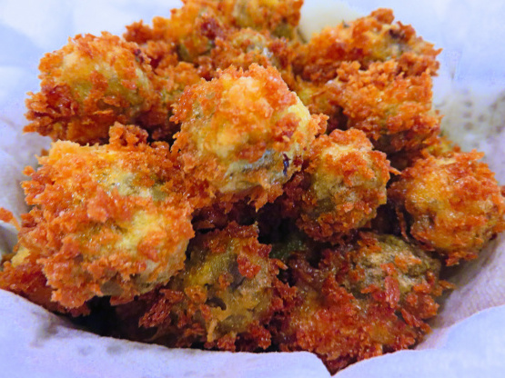 Fry olives in batches for 30 to 45 seconds until golden brown.