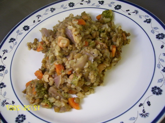 Ajouter le mélange de lentilles/riz au mélange de légumes lorsque les deux sont cuits. Ajouter les noix de cajou. Mélangez bien le tout.