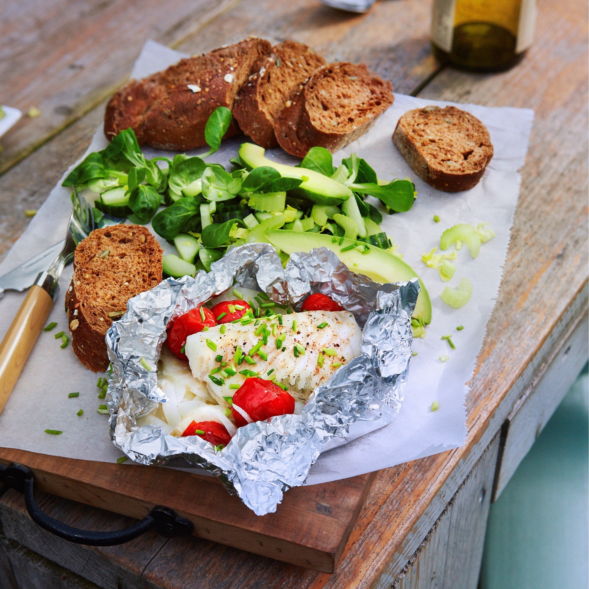 Saupoudrer d'huile d'olive et bien replier la feuille dans des emballages. Cuire environ 20 minutes dans un barbecue fermé. Les paquets de poisson du barbecue sont parfaits avec la baguette.