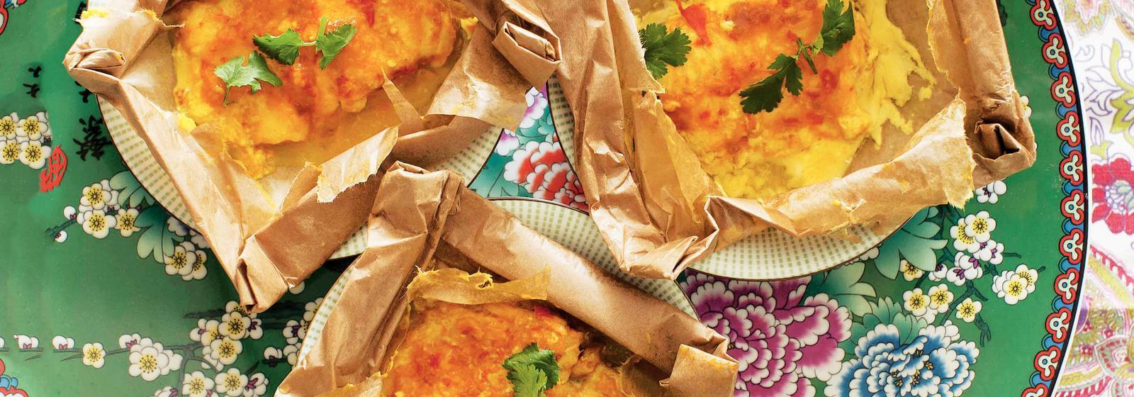 Ajoutez le poisson, l'oeuf et le sel au goût. Coupez 4 morceaux de papier sulfurisé de 30 x 30 cm. Mettez 1/4 du mélange au milieu de chaque morceau de papier. Répartissez le lait de coco dessus et pliez bien chaque paquet (et papillotte).