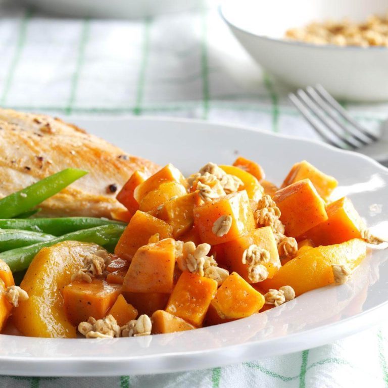 Il ne faut que cinq ingrédients pour créer ce plat d'accompagnement à la patate douce.Je trouve que c'est un excellent moyen de libérer mon four pour d'autres plats.La recette est plutôt sucrée et le granola ajoute un effet croustillant supplémentaire.