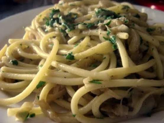 Cuire jusqu'à ce que l'ail commence à brunir légèrement, puis ajouter la sauce tomate et cuire encore cinq minutes, puis mettre les pâtes cuites dans la sauce et bien mélanger et servir.
