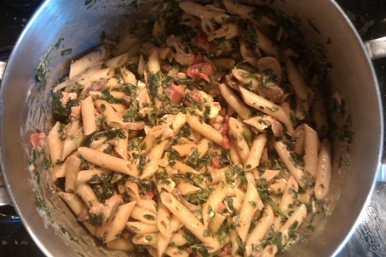 Dans une grande casserole, mélanger la sauce Alfredo, les tomates, la sauce tomate, les champignons, les épinards et encore des flocons de piment rouge (au goût). Laisser tiédir 15 à 20 minutes.