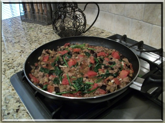 Faire sauter les aubergines et l'ail dans l'huile d'olive jusqu'à ce qu'elles soient tendres.Retirez-les dans une assiette.Dans la même poêle, faites cuire la saucisse.Ajoutez le vin rouge et grattez les morceaux bruns au fond de la poêle.Réduisez le bouillon .Ajoutez tomates écrasées à la main.Remettez les aubergines dans la casserole et salez-les au goût.Ajoutez éventuellement des épinards ou du basilic frais.Semettez-les jusqu'à une heure (habituellement environ 30 minutes) jusqu'à ce que la sauce ait légèrement épaissie et que la sauce ait épaissi.Servez sur un penne pour un repas sans glouton..