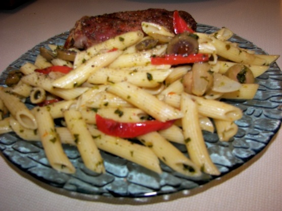 Au Canada, c'est Salade de pâtes au poivron, ou du moins ils le disent. Je ne l'ai pas encore essayé car je le publie pour le WT 06. Dans la recette originale de Debra Weber, elle dit que vous pouvez utiliser 20 petites ni les olives Kalmata, mais cela ne me laisserait pas le poster, alors je le mets ici. Cela sonne vraiment bien.