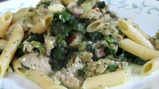 Egouttez les pâtes et remettez-les dans la casserole. Incorporer la saucisse, les blettes, la ricotta salata, le bouillon de poulet, l'origan et le persil et assaisonner de sel et de poivre; mélanger bien.
