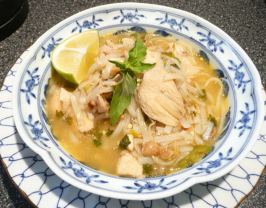Râpez la viande avec vos mains.Ajoutez-la et les nouilles à la marmite de bouillon de poulet.Ajoutez une petite poignée d'oignons verts et la moitié de la coriandre.Glacez la soupe dans des bols et servez avec du basilic thaï, des choux, du citron vert, du jalapeno, et sauce chili-ail.