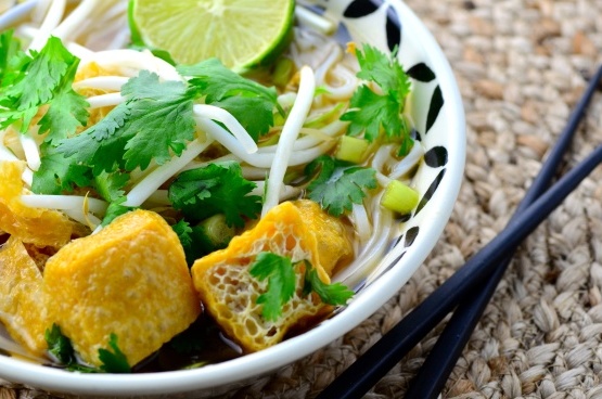 Pendant que le bouillon mijote, préparez les nouilles au riz.Placez les nouilles dans un grand bol.Versez de l'eau bouillante sur les nouilles pour couvrir et laissez tremper pendant 20 minutes.