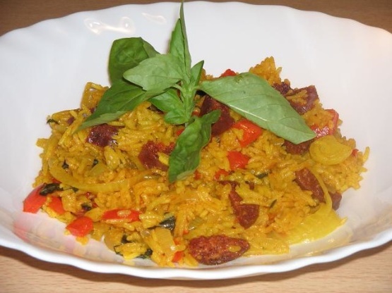 C'est un plat épicé et parfumé avec du riz moelleux.Vous pouvez utiliser de l'agneau épicé, du poulet ou des saucisses italiennes au lieu du chorizo.Je change souvent la saveur en utilisant des épices et des herbes différentes.En outre, j'ajoute parfois des pois surgelés ou des haricots verts. gros sert.Mesures australiennes utilisées.