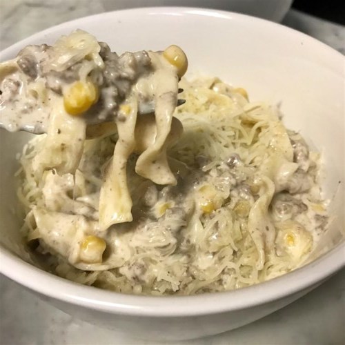 Un délicieux dîner de boeuf haché crémeux avec des nouilles et du maïs garni de fromage.