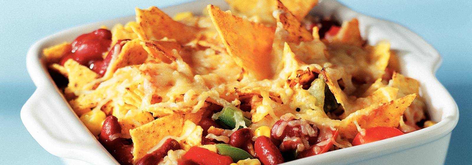 Une belle recette mexicaine. Le plat principal contient les ingrédients suivants: poisson, oignons, courgettes, filet de morue (245 g), beurre ou margarine, légume mexicain (620 g), assaisonnement à la mexicaine (saupoudrer de 100 g), chips de tortilla (150 g) et fromage à pâte moulue (sac de 150 g).