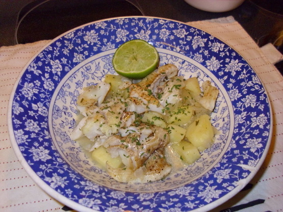 Versez 1/2 litre d'eau dans une casserole et ajoutez les oignons, l'ail, le persil et le thym, les pommes de terre, le beurre et le piment.Portez à ébullition et laissez bouillir environ 10 minutes ou jusqu'à ce que les pommes de terre soient presque cuites (ajoutez de l'eau, si nécessaire). nécessaire).