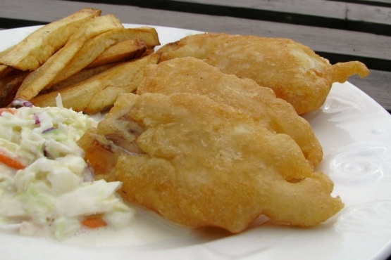 Laisser l'huile revenir à 350. Draguer légèrement les lanières de poisson dans la fécule de maïs.Travailler par petites quantités, plonger le poisson dans la pâte et plonger dans l'huile chaude.Lorsque la pâte est prête, retourner les morceaux de poisson et cuire jusqu'à ce qu'ils soient dorés minutes. Égouttez le poisson sur la grille de cuisson. Servir avec du vinaigre de malt.