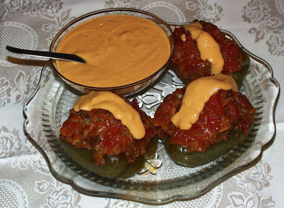 Note on 8/27: I did not try this recipe b4 I entered it, but I have now.This makes a farily lrg amt of stuffing & it is best to halve the peppers & mound the stuffing equally as pictured.This does not chg the cooking time.The stuffed peppers are very good & the sauce is the "shining star" -- so use it generously.Enjoy!