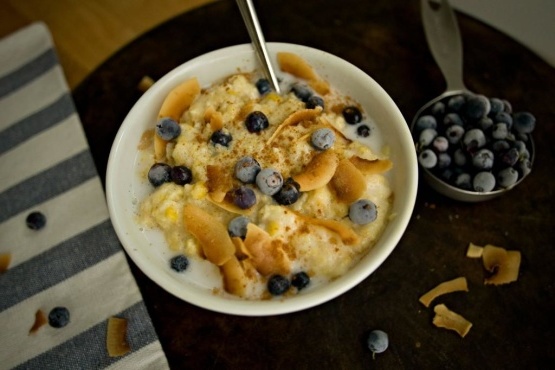 Dans une casserole moyenne, porter à ébullition 3/4 litre de lait de coco. Ajouter la polenta sèche et fouetter continuellement pendant environ 5 minutes, jusqu'à ce qu'elle soit très épaisse.