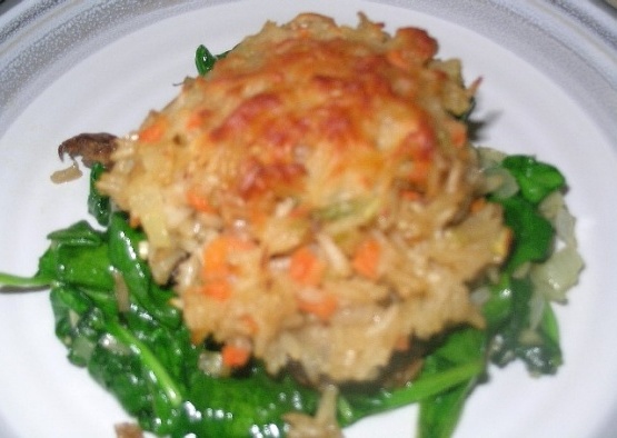 Disposer ½ tasse d'épinards sur chaque assiette et y déposer les capsules de champignons.