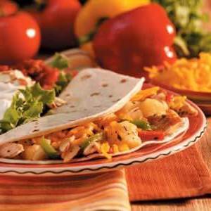 Romance suggérée: Servir avec de la crème sure, du fromage cheddar râpé, de la salsa et des amandes grillées.Le miel et l'ananas ajoutent une touche de douceur à ces fajitas que ma famille adore. J'aime les servir avec une salade de chou et des pommes de terre au four ou frites. — Raymonde Bourgeois, Swastika , Ontario