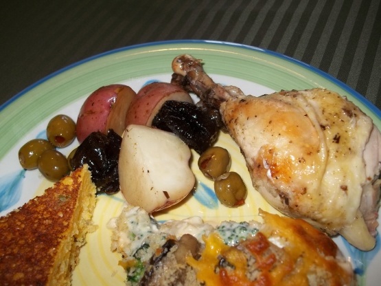 Chauffer le four à 400.Graissez une rôtissoire à couvercle profond ou un four ovale de 8 litres avec 1 cuillerée à thé d'huile.Rincez le poulet et séchez-le en tapotant. Dans un petit bol, mélangez l'ail, l'origan, les 3 cuillères à thé d'huile restantes. saler et poivrer.Rubarez le mélange sur tout le poulet.Fixez les cuisses de poulet avec de la ficelle de cuisine.Remballez les bouts des ailes sous le dos.Mettez le poulet dans la casserole et ajoutez le bouillon, le vinaigre et les olives.Ensemblez de sucre brun. Couvrez et faites cuire 1 heure, puis éparpillez les pommes de terre et les pruneaux autour du poulet.Couvrez et faites cuire 30 à 45 minutes de plus, en remuant les pommes de terre une fois, jusqu'à ce que le pilon bouge facilement, le jus s'écoule quand une cuisse est percée avec un couteau les pommes de terre sont tendres.