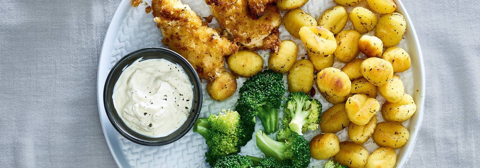 Poulet à la mayonnaise, gnocchi, brocoli et panko.