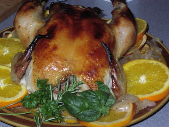 Insérez une orange entière dans le poulet. Déposer dans un plat à rôtir, poitrine vers le bas, et l'entourer de tranches d'oignon.