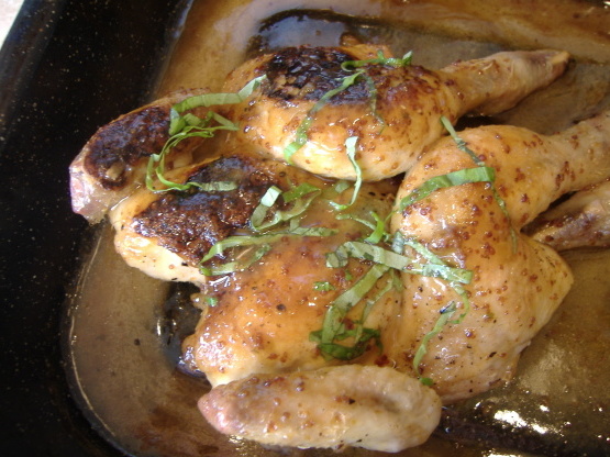 Placer le poulet sur les assiettes, parsemer du reste du persil ou du basilic et servir.