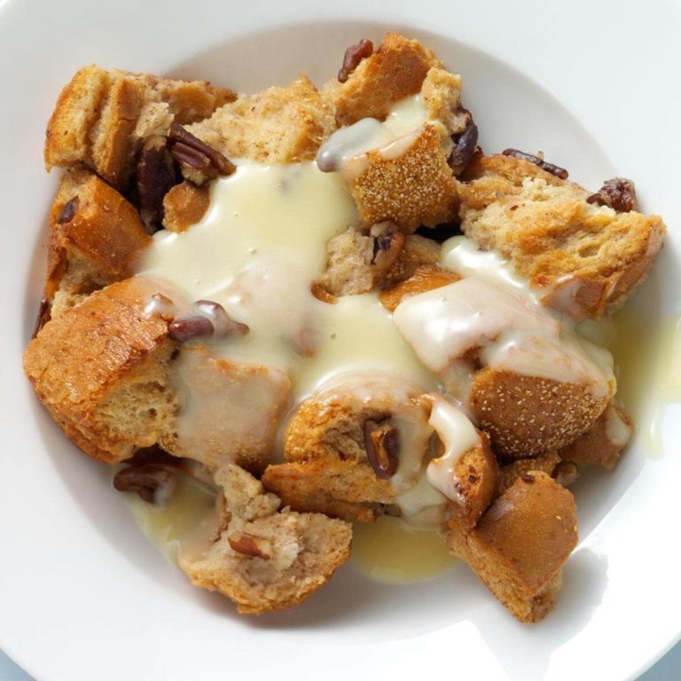 Pudding de pain aux pacanes avec sauce au rhum