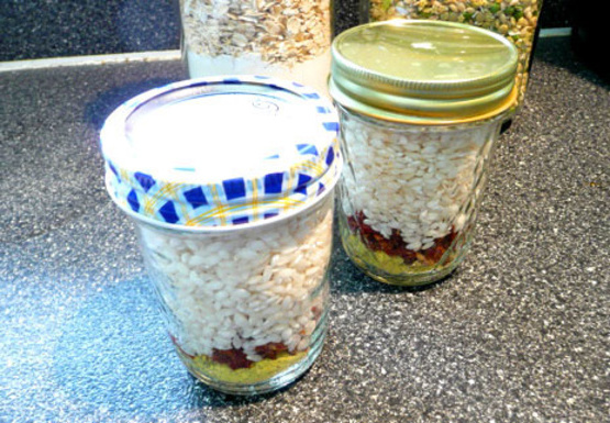Voici une recette simple et délicieuse de cadeau-en-pot que j'ai donnée pour Noël cette année. Elle est magnifique et j'ai obtenu des critiques élogieuses sur le goût! La recette originale provient du livre de recettes édition 6 Better Homes and Gardens - je l'ai modifiée un peu pour répondre à mes goûts! Cela fera des cadeaux de 2 litres (j'ai posé le mien dans des bocaux à bocal avec une demi-bouche large et utilisé les capuchons de stockage en plastique au lieu des couvercles et des anneaux de mise en conserve habituels.) Coupez des tomates roma en fines lamelles et séchez-les jusqu'à ce qu'elles soient sèches!), mais vous pouvez utiliser des produits achetés en magasin. Assurez-vous simplement de ne pas obtenir ceux qui sont emballés dans de l'huile! Le temps de préparation donné est le temps nécessaire pour créer les cadeaux et le temps de cuisson est le temps nécessaire pour préparer 1 pot du risotto.Une bonne idée de cadeau serait de donner ce mélange avec un coin de Fin du parmesan et une bouteille de vin! Chaque pot servira 6 une fois fait.