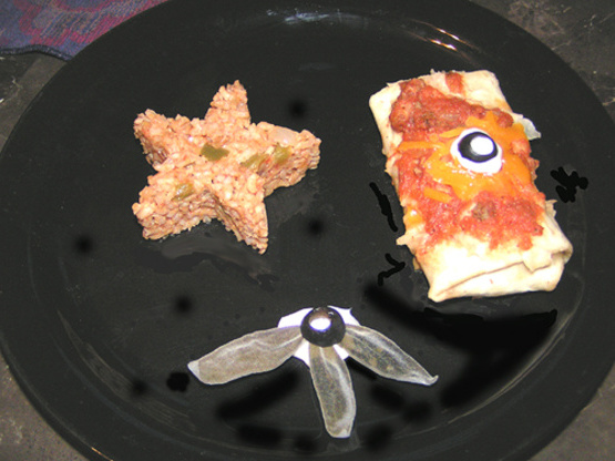 Allow to stand, removed from heat, for 5-8 minutes, fluff with a fork, garnish with cheese and black olives, and serve hot!