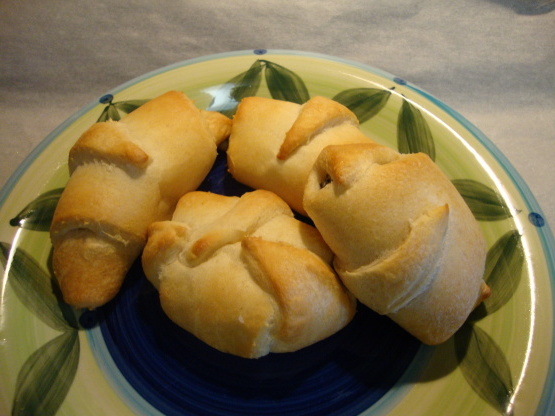 Étendez une cuillère à soupe du mélange de fromage à la crème sur chaque triangle.Roulez et placez sur une plaque à pâtisserie.Répétez pour obtenir le reste de la pâte pour croissants-croissants. (Pour 32 "mini" petits pains).
