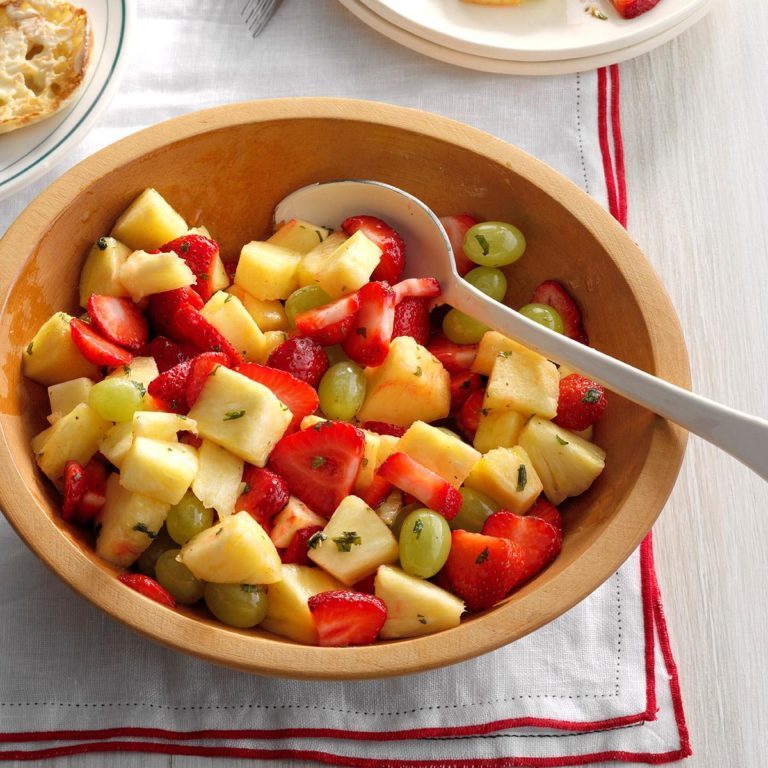 La menthe fraîche ajoute une saveur éclatante à cette salade d'ananas facile, rapide et faible en gras. Donnez-lui une touche de baie en utilisant des bleuets et des framboises à la place des raisins, mais n'oubliez pas l'ingrédient secret de la vinaigrette, la limonade! —Janie Colle, Hutchinson, Kansas