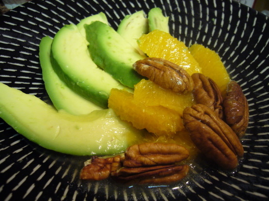Disposez l’orange et l’avocat dans de petites assiettes, à votre convenance, en les décorant avec les noix de pécan. Arroser de la vinaigrette.