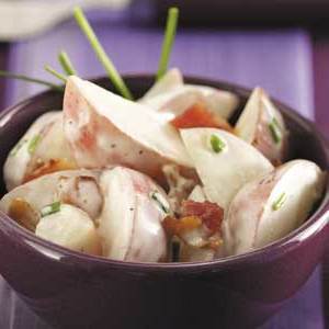 Placez les pommes de terre dans une grande casserole et couvrez-les d'eau.Portez à ébullition.Réduisez le feu; couvrir et cuire pendant 15-20 minutes ou jusqu'à tendreté. Égoutter et laisser refroidir. Couper en quartiers; déposer dans un bol de service.Ajouter le bacon et la ciboulette