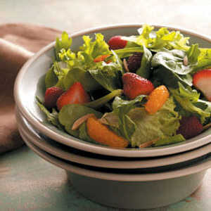 Dans un grand bol, combinez les légumes verts, les oranges, les baies et les amandes.