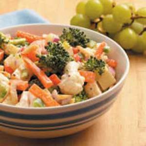 Dans un grand bol, mélanger les six premiers ingrédients.Incorporer le fromage.Dans un petit bol, mélanger le yogourt, la mayonnaise, le mélange d'assaisonnement et le sel.Amener dans le mélange de légumes.Couvrir et réfrigérer au moins 1 heure.Juste avant de servir, saupoudrer aux amandes..