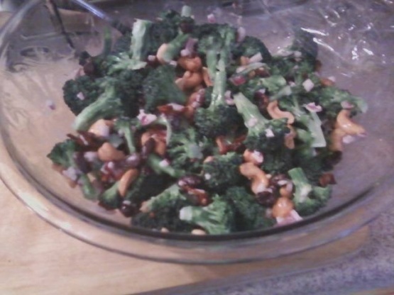 Mélanger le brocoli, le bacon, les noix de cajou, les raisins secs et les oignons dans un grand bol. Dans un second bol, battre les ingrédients de la vinaigrette ensemble doucement jusqu'à consistance lisse.