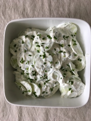 Mélanger la crème sure, le vinaigre, la ciboulette, l'aneth, le sucre et le poivre.Verser sur les concombres.Ajoutez du sel, si nécessaire, au goût.