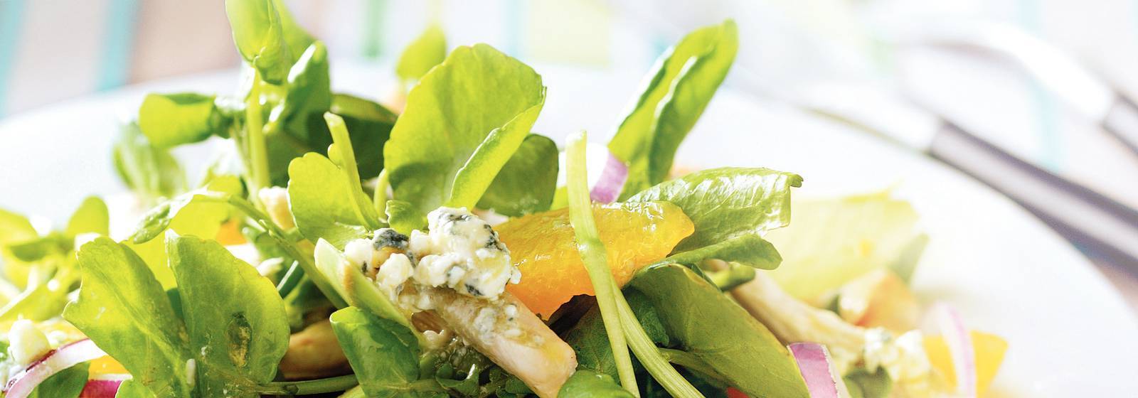 Découpez les segments entre les membranes de l'orange. Couper l'avocat en deux. Retirez le noyau et coupez-le en tranches. Cuillère à l'orange. Verser le cresson dans la vinaigrette et déposer le poulet, le mélange d’orange à l’avocat et les rondelles d’oignon. Saupoudrer la salade avec le reste du fromage bleu. Savoureux avec du pain au beurre.