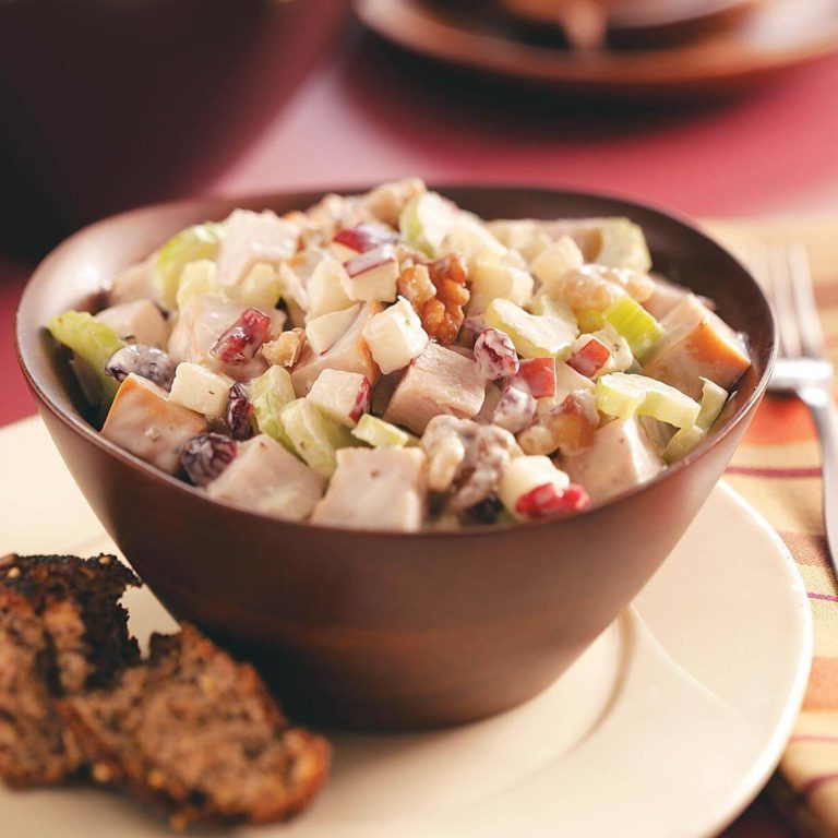 25 minSalades De Dindeyaourt, Mayonnaise, mon chéri, moutarde, marjolaine, gingembre, dinde, Pomme, côtes de céleri, canneberges, noix,salade de dinde aux fruits d'hiver -