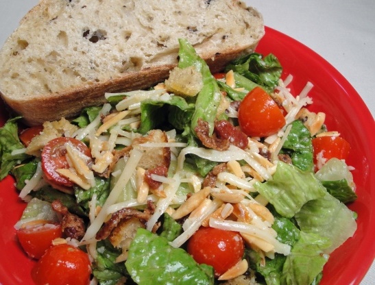 Amandes légèrement grillées. Mélanger et réserver. Laisser couler la laitue, les tomates, le fromage suisse, les amandes, le parmesan, les croûtons et le bacon. Préparer la vinaigrette en mélangeant jus de citron, sel, huile, ail et poivre à soupe. Verser sur la salade, mélanger et servir immédiatement.
