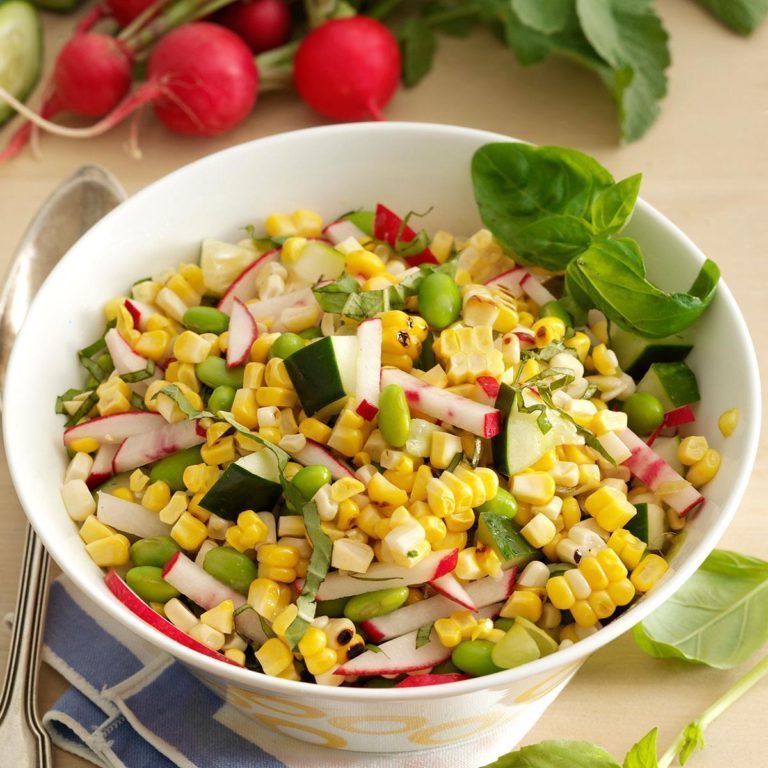 Couper le maïs des épis; transférer dans un grand bol.Ajouter les légumes et le basilic.Dans un petit bol, fouetter les ingrédients de la vinaigrette.Verser sur les légumes; mélanger pour enduire.