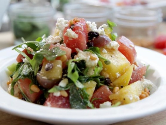 Mélangez la pastèque, le concombre, les tomates, la feta, le basilic et la menthe.Ajoutez la roquette et les pignons.Plaquez et ajoutez les groseilles et 85 grammes de la vinaigrette à la grenade.