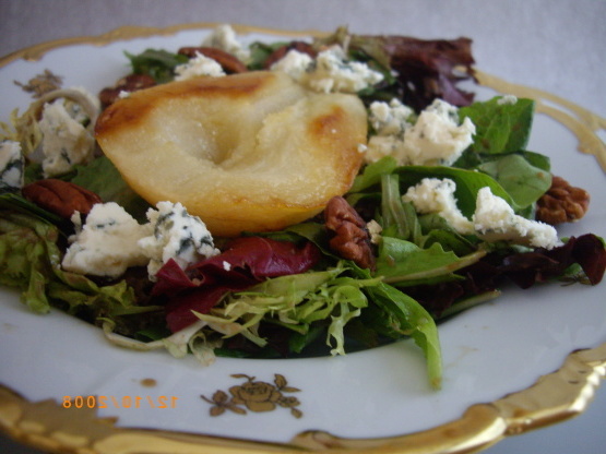 Garnir chaque portion avec une moitié de poire et garnir de fromage bleu et de noix.