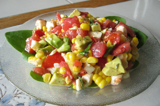Faites et partagez cette recette de salade de mozzarella fraîche avec avocat, maïs rôti et tomates.
