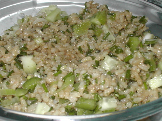 Une salade de riz froide qui est un excellent compagnon en été.Elle est également un plat pratique pour préparer les repas à l'avance pour les grands rassemblements.Vous pouvez jouer avec les herbes utilisées dans la salade.Il faut se rappeler que l'herbe ajouté alors que le riz est encore chaud sera la saveur dominante.