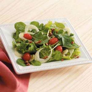 Dans un grand bol à salade, combinez la laitue, la roquette, le fenouil et les tomates.Dans un pot avec un couvercle hermétique, mélangez le reste des ingrédients; Bien agiter. Arroser de la salade et mélanger pour bien enrober. Ajouter les pacanes sucrées. Servir immédiatement.