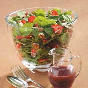 Juste avant de servir, mélanger les épinards, les fraises et les pacanes dans un grand bol à salade. Servir avec la vinaigrette.
