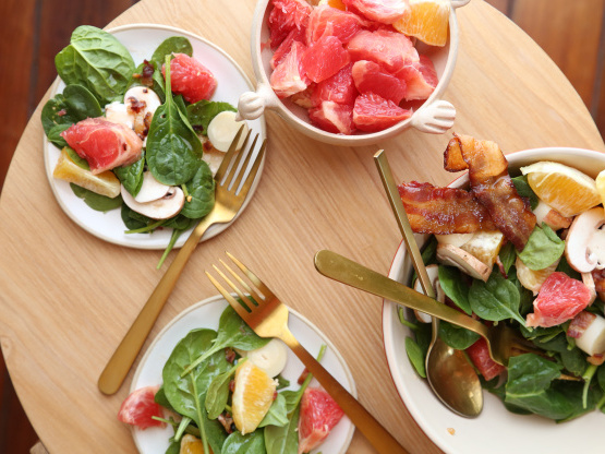 50 minDes orangesépinard, jus de pamplemousse, section d'oranges, châtaignes, pétrole, jus de pamplemousse, vinaigre de vin, sauce soja, sauce, champignon, Bacon,salade d'épinards au pamplemousse